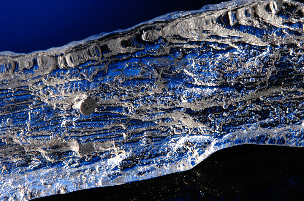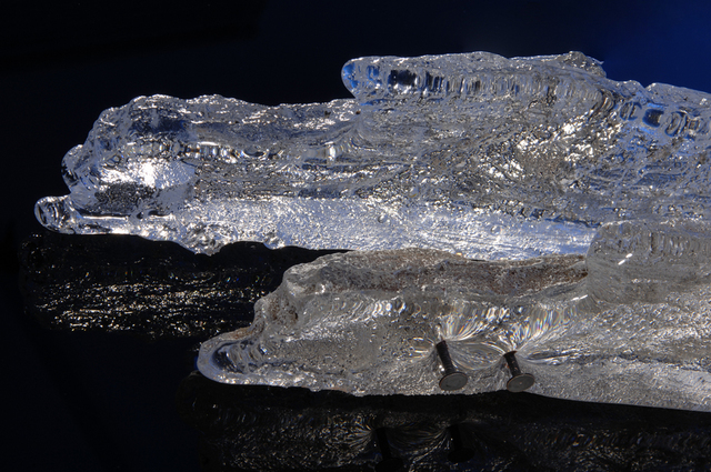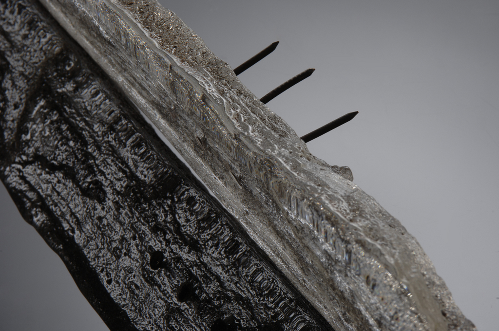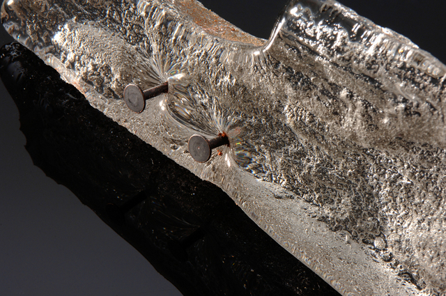 These pieces are either cast in a plaster mould in a kiln or cast directly from a furnace into a sand mould. The inclusion of the nails into the sand cast pieces adds a degree of tension to the forms as well as providing a contrast between the clarity of the glass and the roughness of the metal.